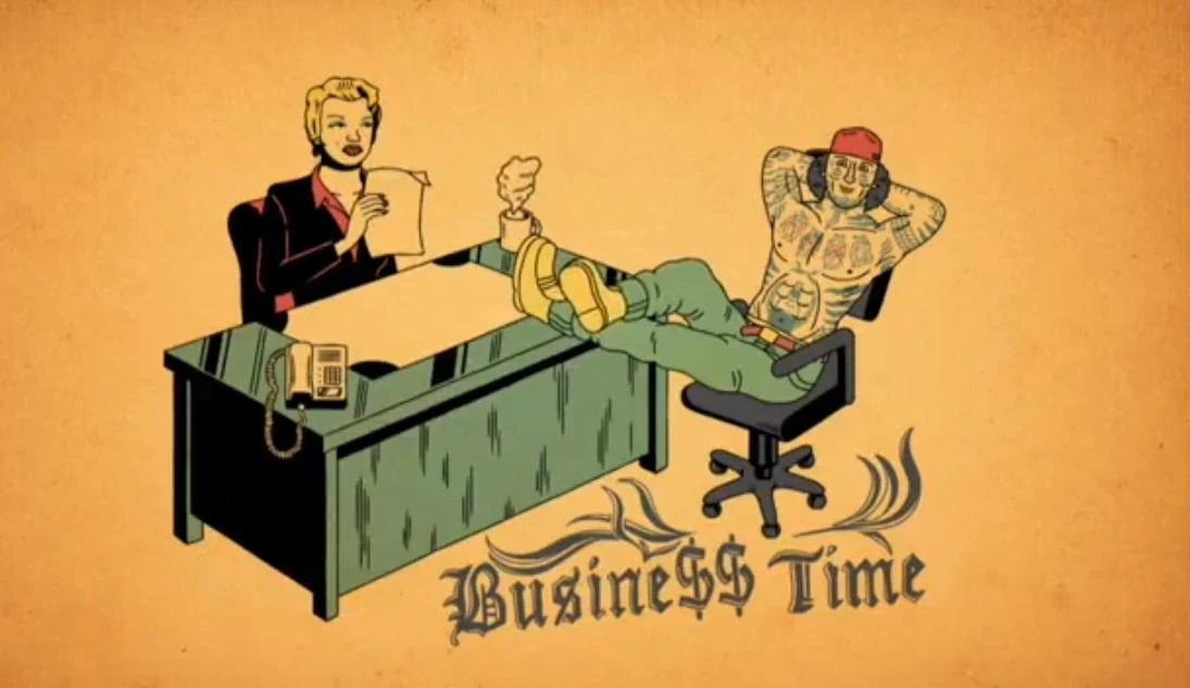 - Marilyn Monroe in office attire at a desk over the words "Business Time"